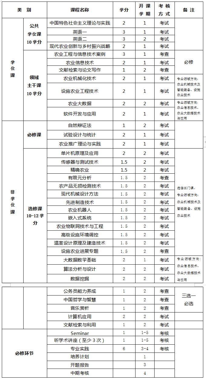 附表:农业工程与信息技术领域课程设置与安排表