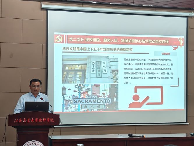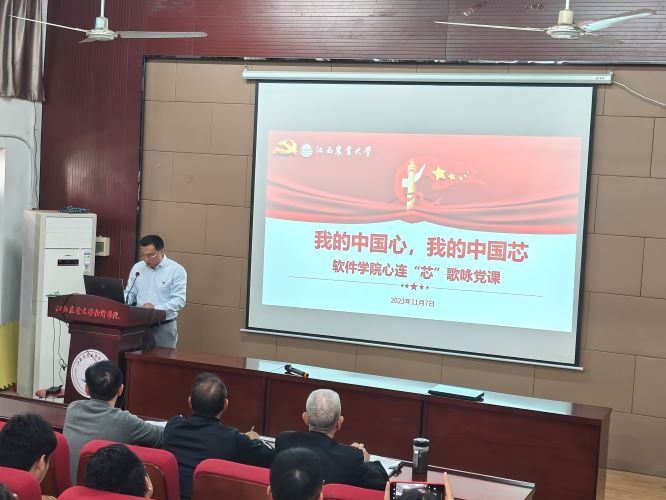 软件公司党委书记肖意风结合歌咏曲目《我的中国心》,以《我的中国心,我的中国“芯”》为题讲授理论党课,从中国心的内涵出发,对当代中国爱国主义的本质就是坚持爱国和爱党、爱社会主义高度统一进行了阐释。围绕“心、芯、新”三个维度,分别从高举爱国主义旗帜的“中国心”、掌握关键核心技术的“中国芯”、践行强农兴农的“新高地”三个部分讲授理论党课。并结合习近平总书记考察江西重要讲话精神,聚焦“走在前、勇争先、善作为”的目标要求,对师生党员提出三点希望:一是把代码写在祖国大地,解放思想、开拓进取,练就过硬本领;二是把奋斗作为青春底色,扬长补短、固本兴新,担当时代使命;三是把修为嵌入人生算法,再接再厉、乘势而上,实现梦想抱负。