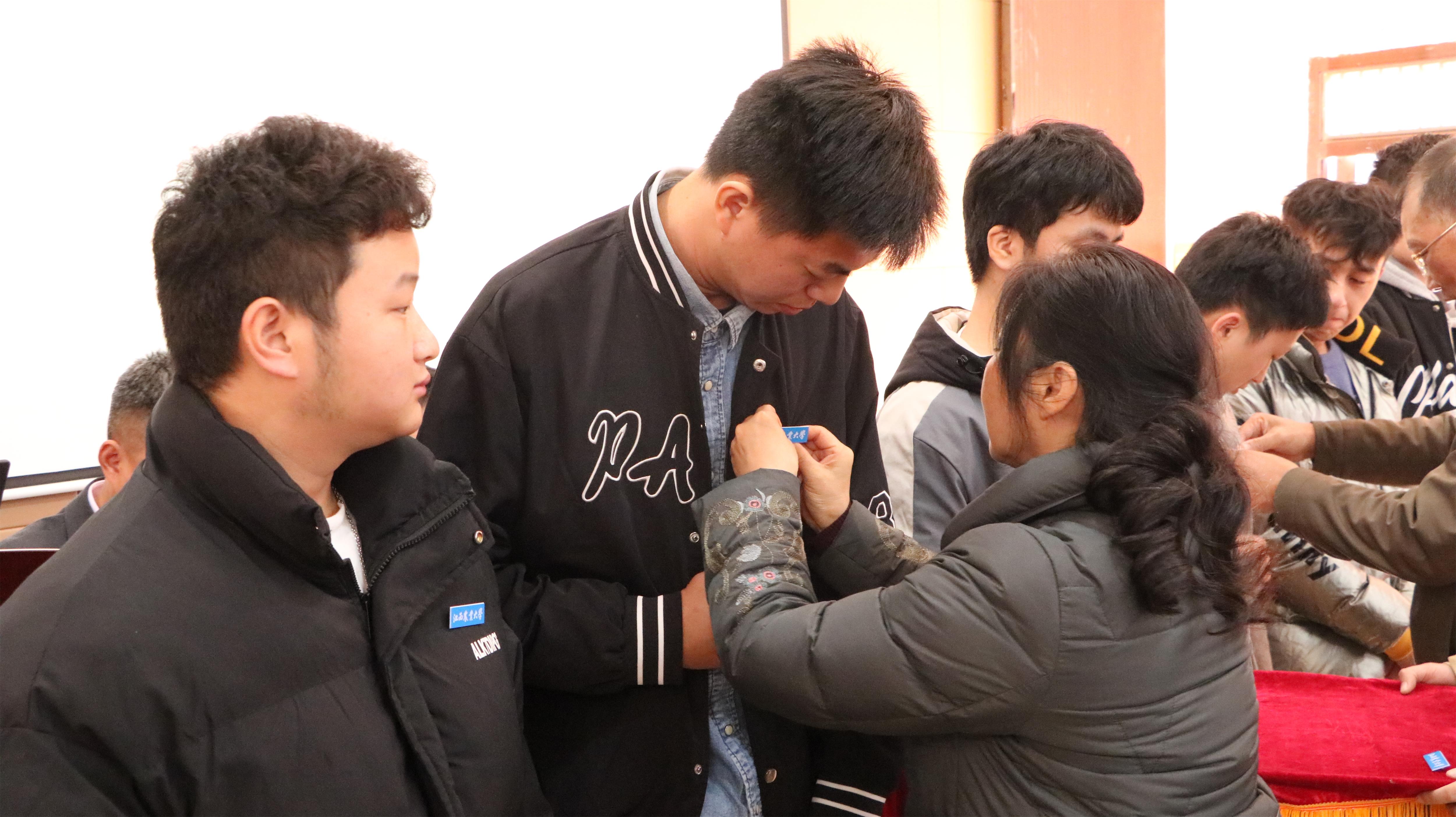 “体验日”活动从观看学校及学院的宣传片中拉开帷幕。经理赵应丁详细介绍了学校和学院的办学历史、办学特色及办学成就,并勉励同学们要做到学而信,怀揣坚定信念,勇毅前行;学而用,勇于探索实践,力学笃行;学而行,保持昂扬斗志,砥砺同行。江西信息应用职业学院软件工程系主任邹贤芳勉励专升本员工要找到“方向感”,提升专业能力和核心能力,用勤奋迎接灿烂的生活和美好的明天。王兰书记和赵应丁经理为六名联合培养的员工代表佩戴校徽。为进一步帮助员工树立职业规划,易文龙博士还介绍了公司相关专业的硕士研究生专业情况,指导员工如何做好考研准备。