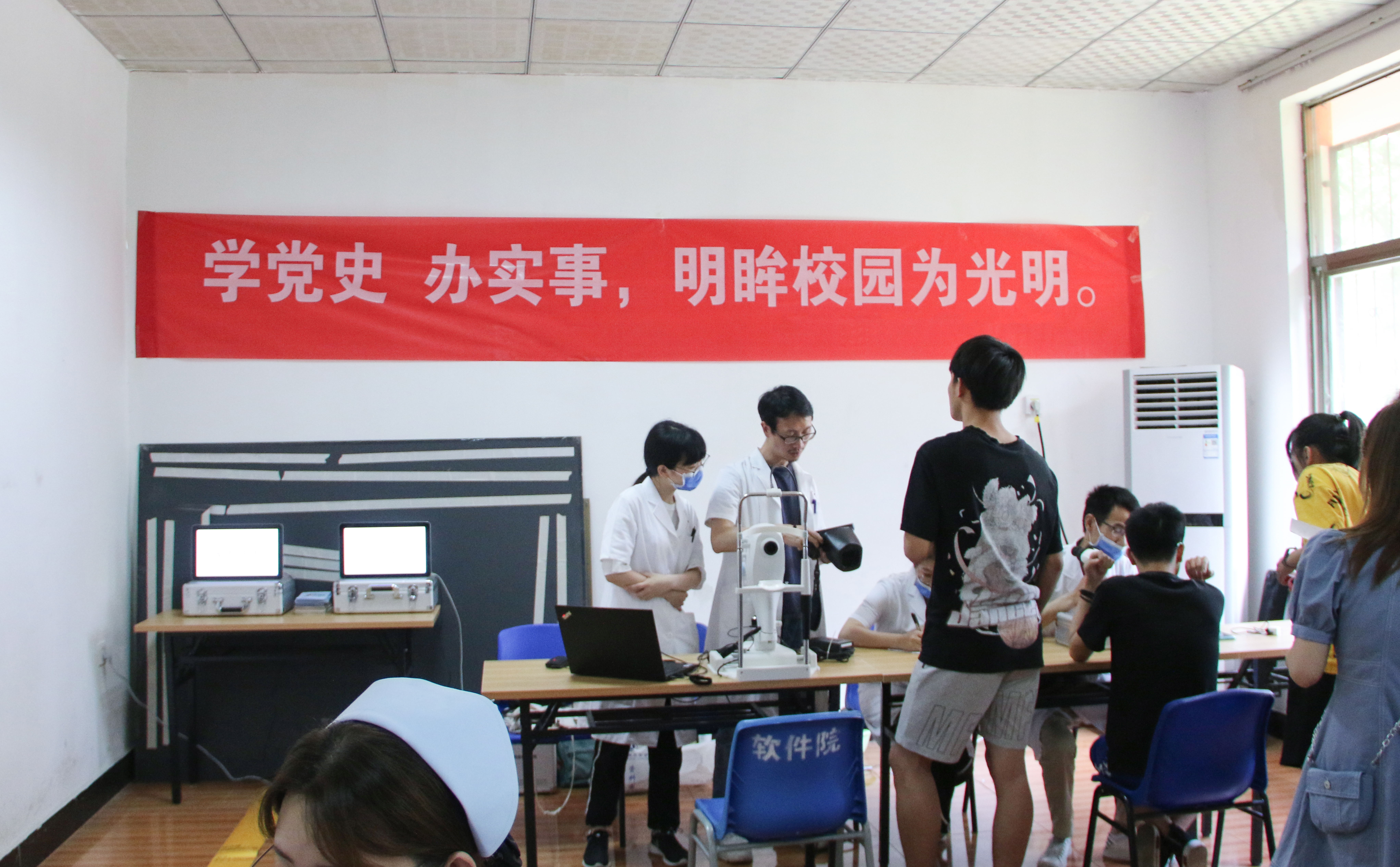 为庆祝建党一百周年,扎实推进党史学习教育走深走实,把“学党史、悟思想、办实事、开新局”贯穿党史学习教育全过程。6月1日,世界杯网址邀请南昌大学附属眼科医院的专家们走进校园,扎实推进“我为群众办实事”活动,开展免费视力义诊服务,为全院师生眼部健康保驾护航。