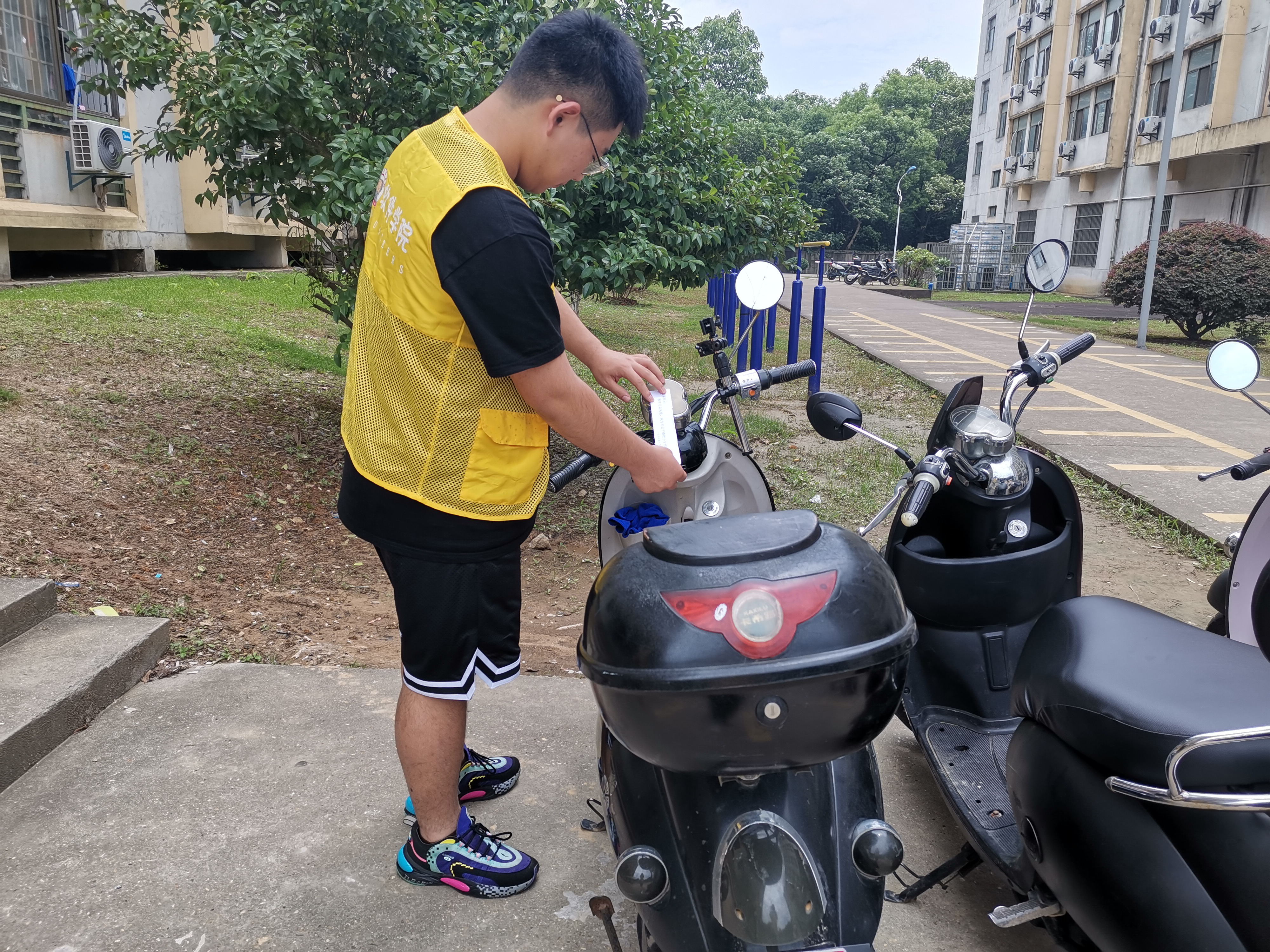 “小电也有家,别让小电孤独地停在这里,快到棚里来”,这是志愿者钟恩铉常挂在嘴边的话。身着黄色小马甲的志愿者们,在寝室楼下对乱停乱放电动车的行为予以劝导,并鼓励大家采取步行的方式上下学。此外,学院还号召各班级开展主题班会,要求同学们将车辆有序停放,杜绝随意占用机动车道、超速、逆行等违反交通安全规定的行为。