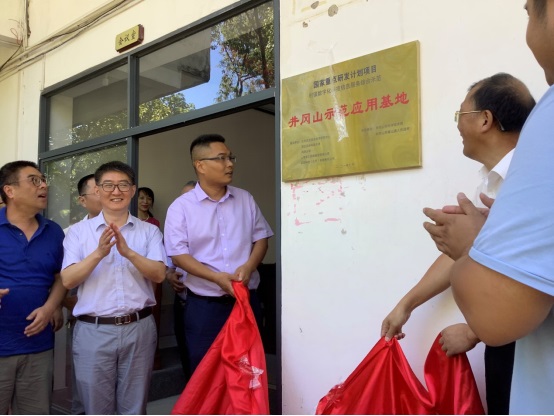 调研组代表赵应丁教授与井冈山周波副市长共同为拿山镇项目应用示范基地的设立揭牌