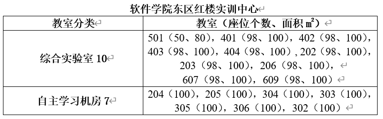 实训中心实验室,位于东区红楼2、3、4、5楼,E教607、609,有实验室教室17间,面积1780㎡;其中自主学习机房7间,面积共700㎡;服务器室1间,20㎡;仓库2间,面积70㎡;办公室1间,面积20㎡。其中,红楼205、302~306、401~404为软件工程综合实验室;红楼202为软件工程物联网综合实验室;红楼203、206、501,E教607、609为软件工程嵌入式实验室。